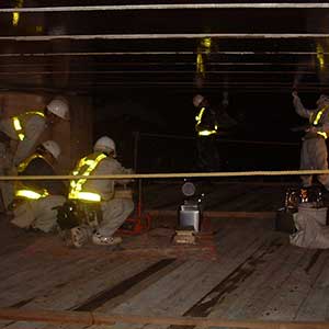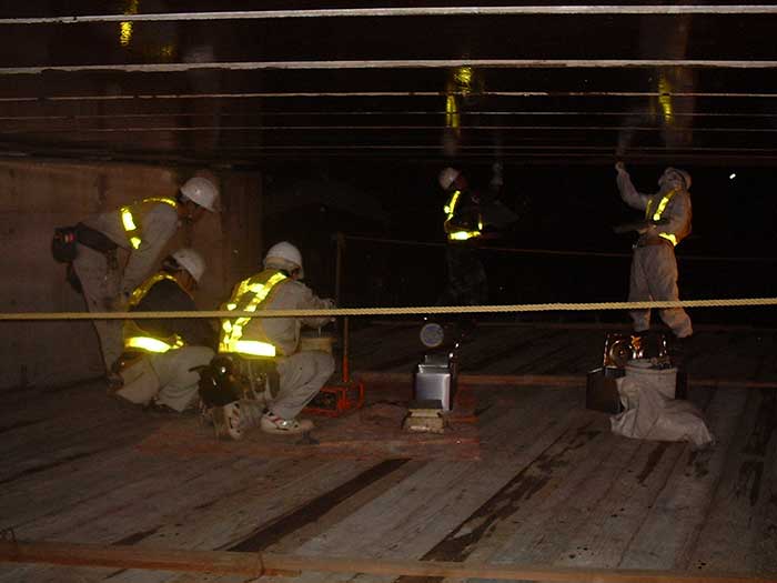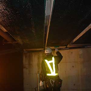 橋梁の強度を上げるために橋の裏側に炭素繊維を全体に塗る作業です。
