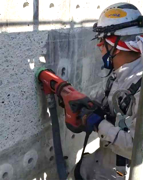 潜水士の有資格者が施工します。大型大容量の集塵機により、コンクリートの表面を研磨すると同時に、無粉塵作業を行います。